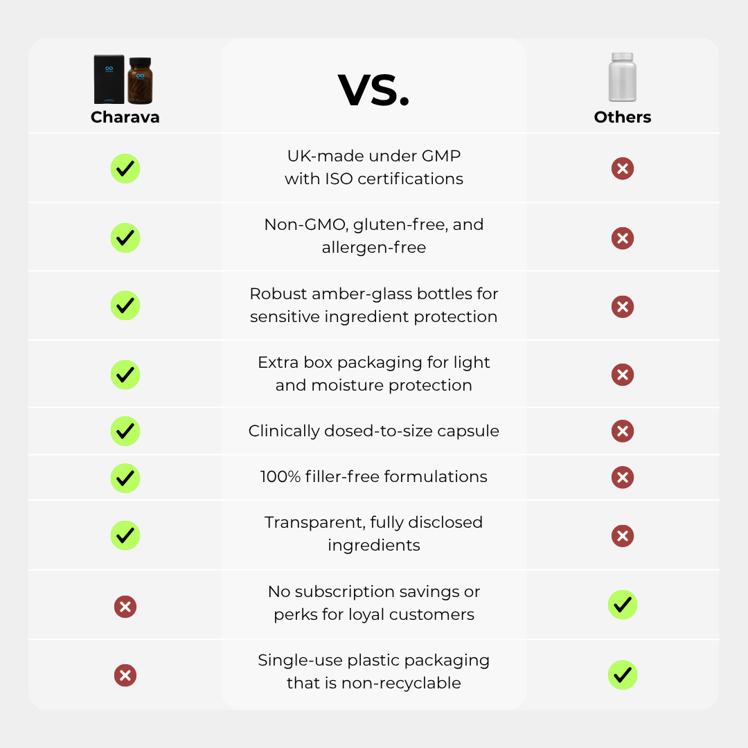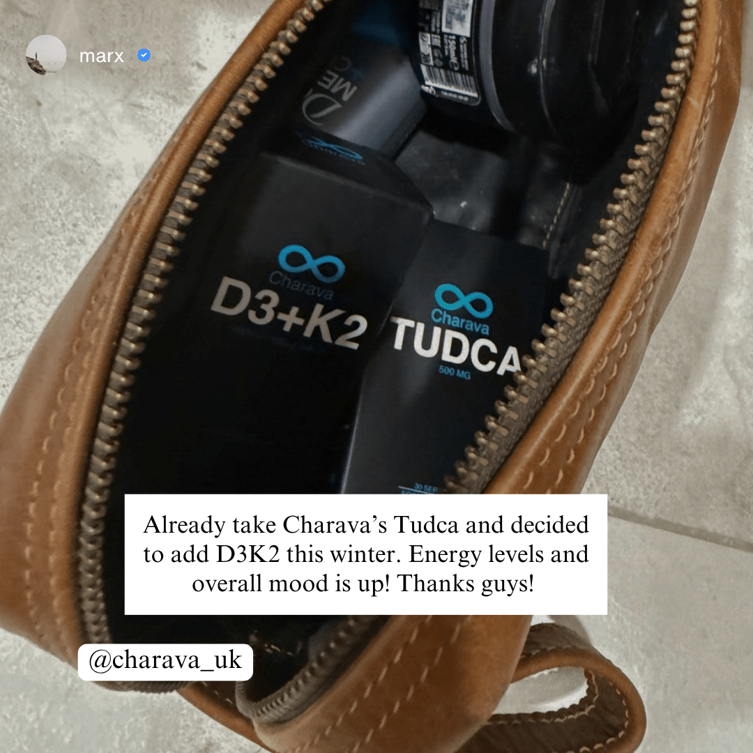 Charava's D3 + K2 delivers 4000 IU of Vitamin D3 and 100μg MK-7 K2 per capsule.