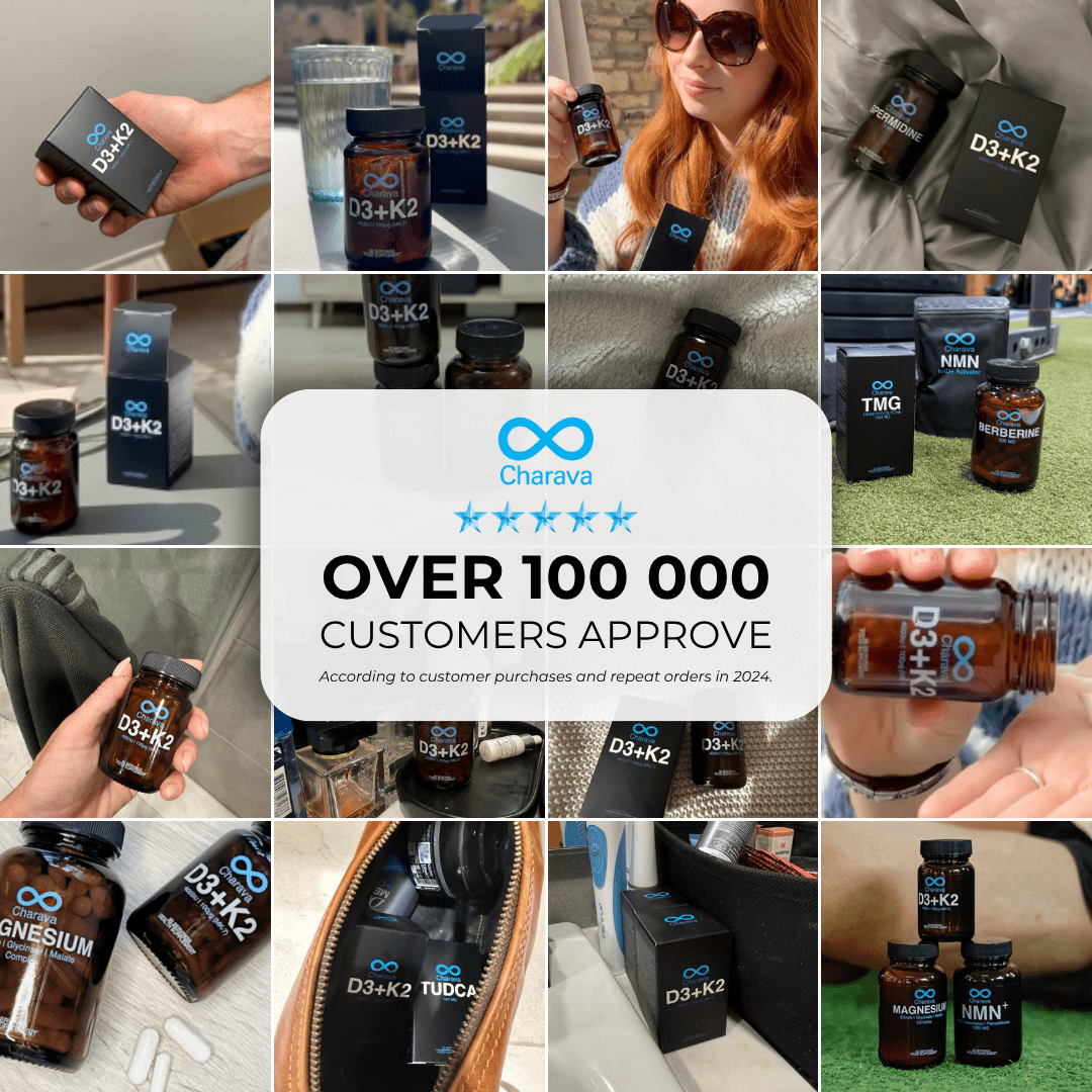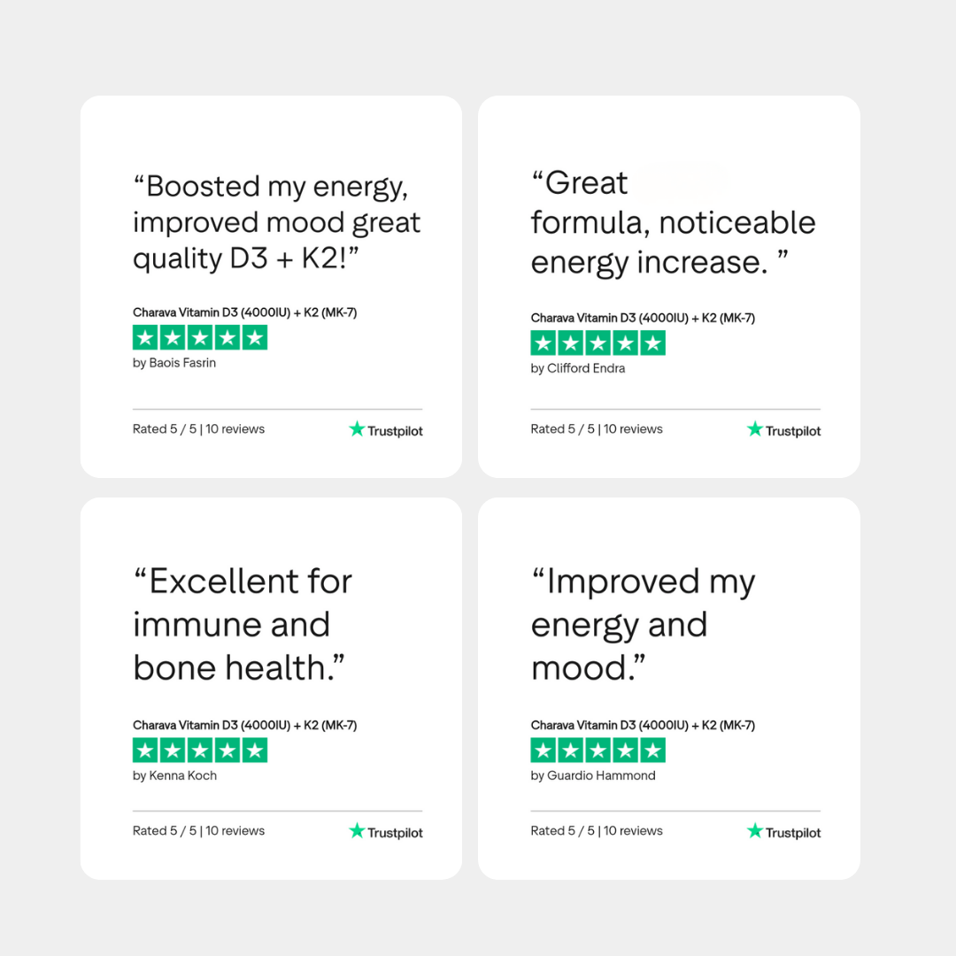 Charava is proud to offer a premium supplement designed to support optimal bone health, immune function, and cardiovascular well-being. Combining the powerful benefits of Vitamin D3 and Vitamin K2, our specific formula ensures that calcium is effectively absorbed and directed to where it’s needed most, your bones and teeth, while preventing calcium buildup in arteries and soft tissues.