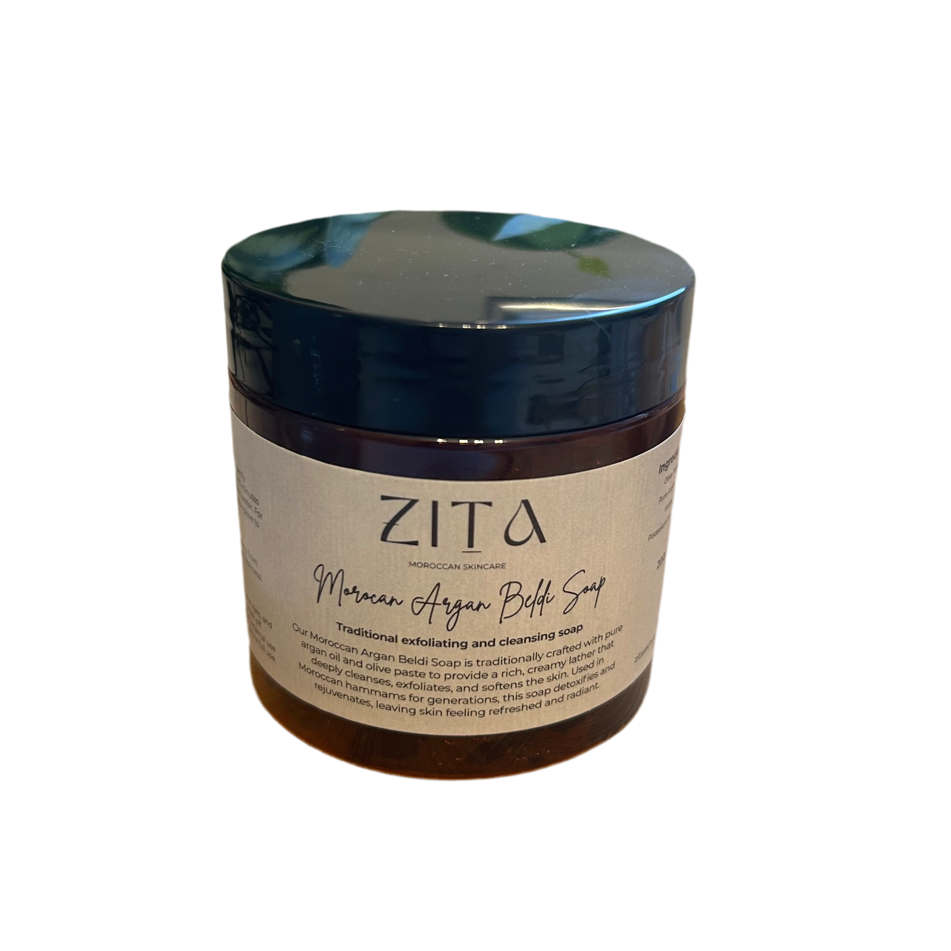 Moroccan Black Beldi Soap is a rich, paste-like soap made from Argania Spinosa Kernel Oil (Argan Oil) and organic olive oil, blended into a smooth, velvety consistency. Traditionally used in the Moroccan Hammam (steam bath), this soap has been used for centuries as a powerful yet gentle exfoliator and skin cleanser. It is known for its ability to remove dead skin cells, unclog pores, and prepare the skin for a deep hydration treatment, all while nourishing and moisturizing the skin.