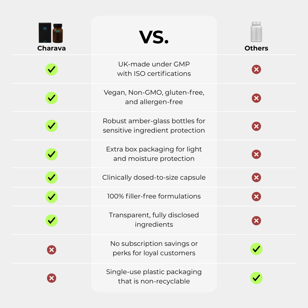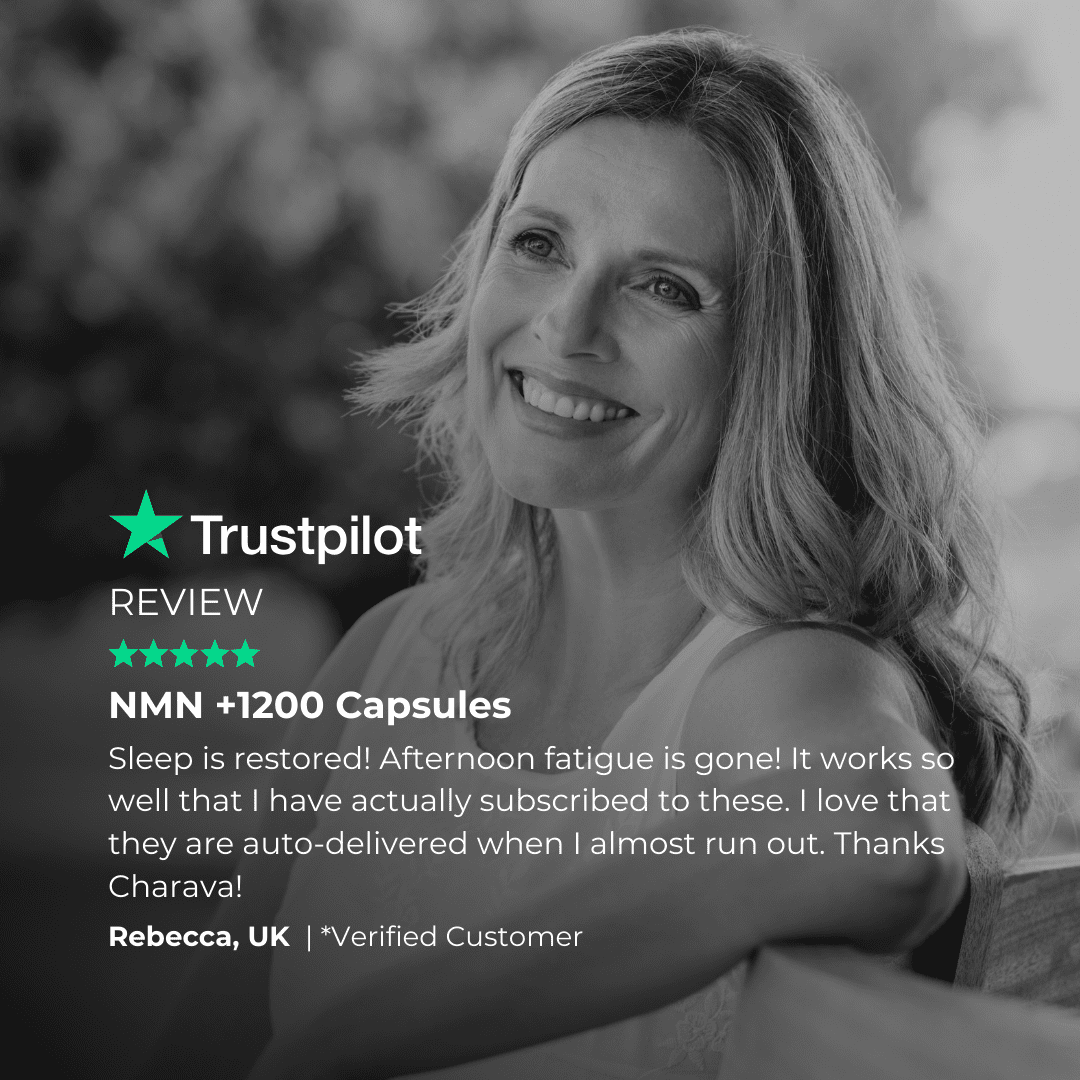 Charava NMN+1200 combines three powerful longevity molecules, Nicotinamide Mononucleotide (NMN), Resveratrol, and Pterostilbene, to support cellular health, energy, and slowed ageing.
