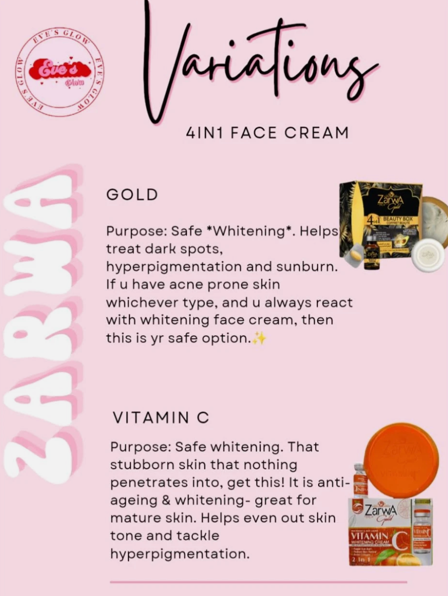 Zarwa body lotion is highly under-rated! It is very effective and has different types to suit your goals, whether its mild lightening or super whitening Zarwa caters to all. This lotion will not give you stretch marks, white dots or green veins. It gives a milky, smooth even toned complexion.